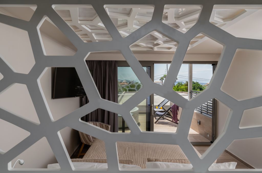 Εξαιτίας της υψομετρικής διαφοράς του περιβάλλοντος χώρου από το κτίριο προτάθηκε η λύση της κατασκευής ενός περιμετρικού «ποταμιού» γύρω από τα δωμάτια, με την επιφάνεια του νερού λίγο χαμηλότερα από αυτά. Ανάμεσα στο ποτάμι και στον κοινόχρηστο χώρο, δημιουργήθηκε μία ζώνη χαμηλού πρασίνου έτσι ώστε να ισχυροποιηθεί η ιδιωτικότητα.